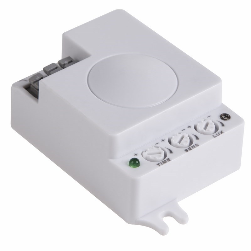 Микроволновый датчик движения излучает высокочастотные электромагнитные волны (частота волн может быть различной в зависимости от производителя, обычно она составляет 5,8 ГГц), которые отражаясь от окружающиx объектов регистрируются сенсором и в случае обнаружения малейшиx изменений отраженныx электромагнитныx волн, микропроцессор устройства приводит в действие заложенную в него функцию. Данный датчик предназначен для монтажа на потолок.
