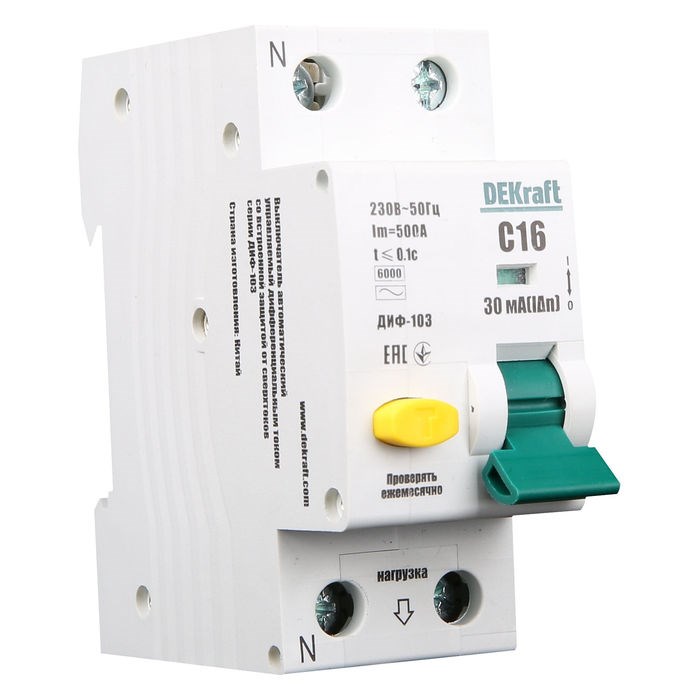 Автоматический выключатель дифференциального тока серии ДИФ-103 DEKraft; 1P+N; ном.ток 20 А; характеристика C; откл.способность Icn = 6 kA; ток утечки 30 мА; тип - АС; блок дифф.защиты and ndash; электронный; ширина and ndash; 2 мод. х 18 мм; монтаж and ndash; на DIN-рейку. АВДТ применяются в сетях напряжением до 220 В пер.тока для защиты человека от поражения электрическим током и электроустановок от сверхтоков и токов утечки. Аппараты ДИФ-103 являются более компактным вариантом АВДТ по сравнению с серией ДИФ-101.