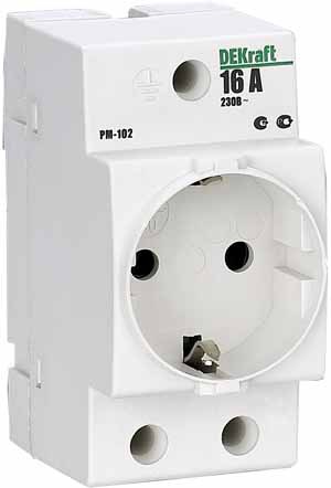 Розетка модульная серии РМ-102 DEKraft; ном.ток and ndash; 16 А; с заземляющим контактом; ширина and ndash; 45 мм; установка and ndash; на DIN-рейку; установочное положение and ndash; любое; степень защиты and ndash; IP20. Розетка модульные предназначены служит для подключения переносных светильников или электрического инструмента малой мощности во время профилактических и ремонтных работ в электрической сборке по месту установки.
