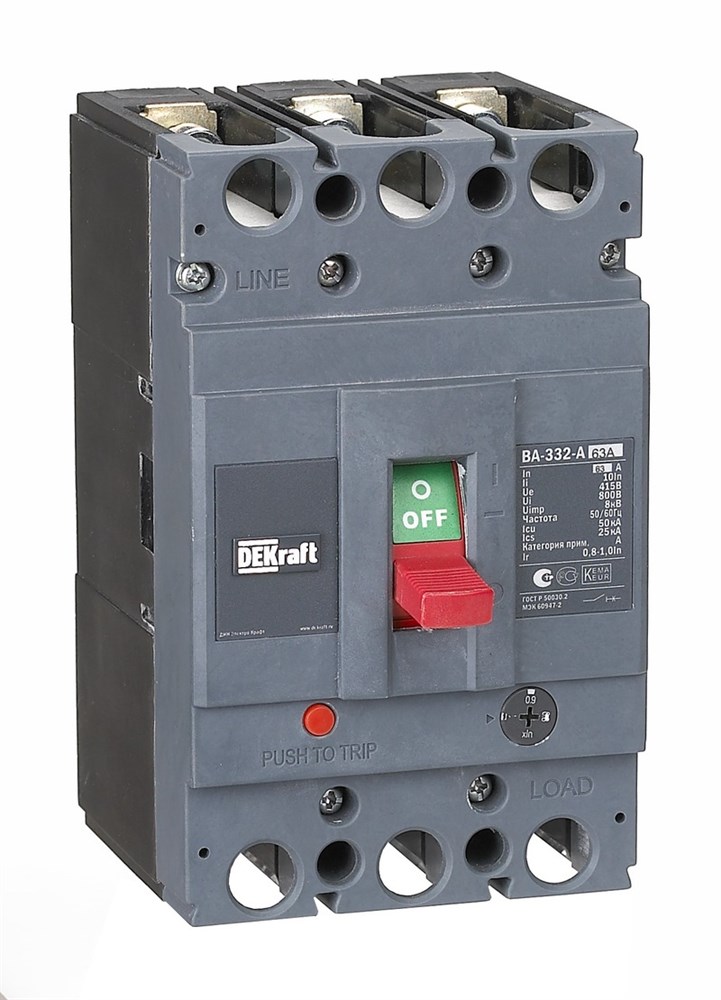 Автоматический выключатель серии ВА-332 DEKraft; 3P; номинальный ток 63 А, отключающая способность Icu = 50 кА (при 415 В 50 Гц); расцепитель and ndash; термомагнитный, регулируемый. В комплект поставки входят 4 межфазные перегородки и крепеж на монтажной плате. В дополнение к выключателям выпускается ряд аксессуаров, расширяющих их функционал: сигнальные контакты, расцепители напряжения, моторные приводы, шины выносные и др.
