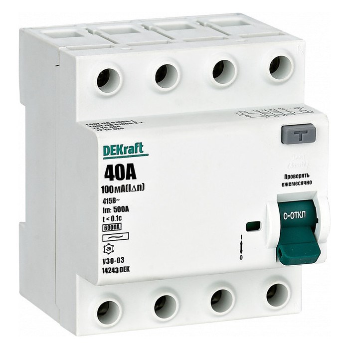 Выключатель дифференциального тока серии УЗО-03 DEKraft; 4P; номинальный ток 40 А; ном.дифф. ток 100 мА; электромеханический; тип дифференциального расцепителя - AC; на DIN-рейку. ВДТ устанавливаются в сетях напряжением до 400 В пер.тока. ВДТ применяются для защиты электроустановок от риска возникновения пожаров вследствие утечек тока. Конструкция устройств позволяет эксплуатировать их даже при низкой температуре. При сборке выключатель дифференциального тока (ВДТ) и автоматический выключатель (для защиты ВДТ) устанавливаются последовательно, при этом номинальный ток аппарата должен быть на одну ступень выше - т. е. 20А при установке последовательно с автоматом на 16А, 32А при установке с автоматом на 25А.