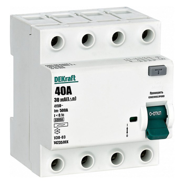 Выключатель дифференциального тока серии УЗО-03 DEKraft; 4P; номинальный ток 40 А; ном.дифф. ток 30 мА; электромеханический; тип дифференциального расцепителя - AC; на DIN-рейку. ВДТ устанавливаются в сетях напряжением до 400 В пер.тока. ВДТ применяются для защиты электроустановок от риска возникновения пожаров вследствие утечек тока. Конструкция устройств позволяет эксплуатировать их даже при низкой температуре. При сборке выключатель дифференциального тока (ВДТ) и автоматический выключатель (для защиты ВДТ) устанавливаются последовательно, при этом номинальный ток аппарата должен быть на одну ступень выше - т. е. 20А при установке последовательно с автоматом на 16А, 32А при установке с автоматом на 25А.