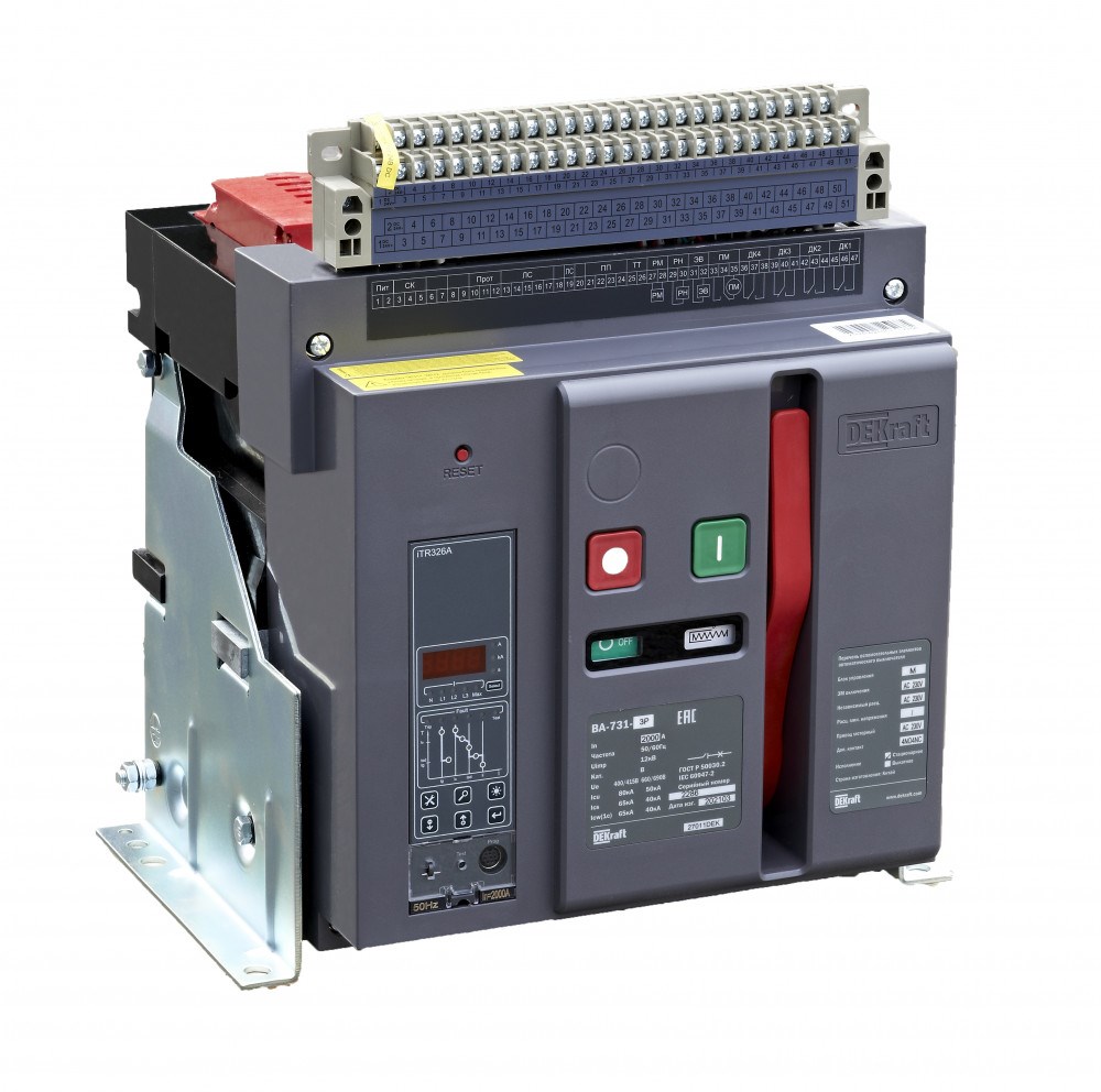 Воздушный автоматический выключатель серии ВА-731 DEKraft; 4P; номинальный ток 800 А; отключающая способность 80 кА, стационарный, блок управления типа M; присоединения задние горизонтальные. В базовую комплектацию входят моторный привод (230 В пер.тока), 4 контакта состояния ВКЛ/ОТКЛ, сигнальный контакт, электромагнит включения (230 В пер.тока), независимый расцепитель (230 В пер.тока), разделители полюсов и рамка передней панели.