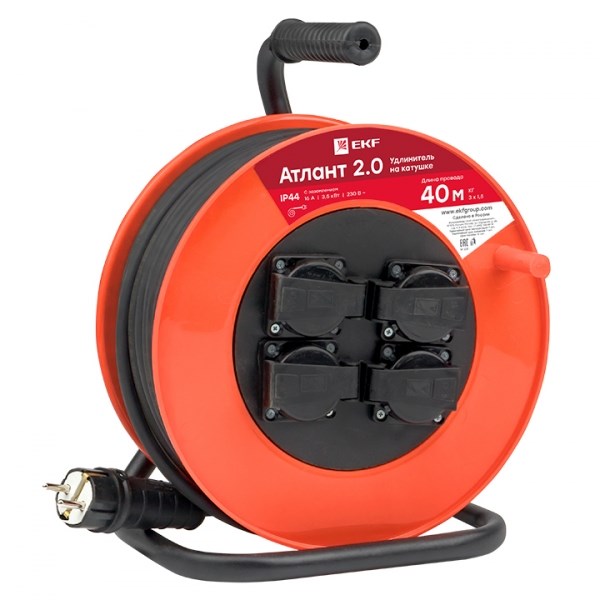 EKF PROxima Удлинитель на катушке "Атлант 2.0" 4 гнезда 40м с заземлением КГ 3*1,5 16А/3,5кВт IP44 UKA02-16-315R-4-40-IP44