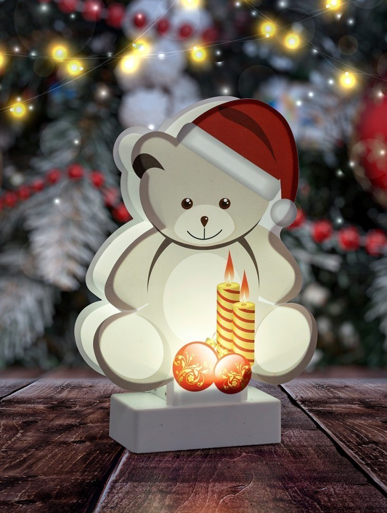 Фигура светодиодная новогодняя ЭРА EGNDS-07 "Мишка" (арт. Б0051931) высотой 24 см с рассеянным холодным светом подарит Вашему дому уютную атмосферу. Этот декоративный светильник украсит любую комнату, включая спальню: приглушенный свет позволяет использовать его в качестве ночника в детской. Светильник работает от 3 батареек AA и имеет класс защиты IP20 (рекомендуется использовать внутри помещений). Настольный зимний светильник в виде мишки в колпаке с новогодними шариками и свечами - это отличный подарок на Новый год и Рождество, особенно для ребенка. Такой новогодний декор для дома всегда создает чудесное праздничное настроение.