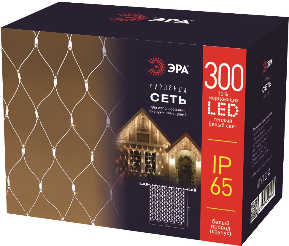 ЭРА ERAPS-SKW1 Гирлянда 300LED Сеть 2м*3м, теплый белый свет, бел. мерц, белый каучук, 220В, IP65 Б0051896