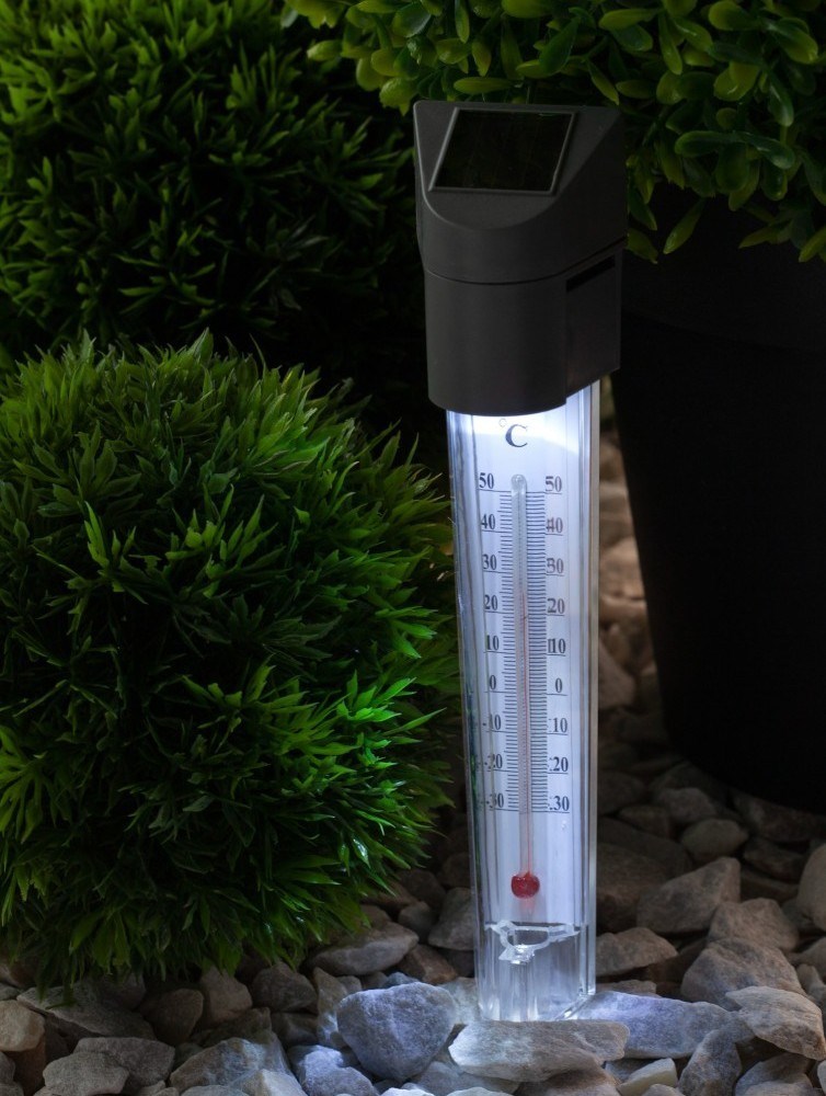 Уличный светильник градусник ERATR024-02 станет практичным дополнением на Вашем загородном участке или дома. Садовый термометр замеряет температуру воздуха. Можно устанавливать на газоне, в цветочный горшок. Устройство из пластика высотой 33 см с легко втыкается в землю с помощью заостренной ножки в комплекте. Садовый светильник работает на солнечной батарее. Данный вид получения энергии является максимально экологичным, энергоемким, а также бесшумным. Питание происходит во включенном режиме, в дневное время. В темное время суток загорается встроенная в корпус лампочка. Высокая степень защиты от пыли и влаги позволяет оставлять светильник на улице даже во время дождя. Декоративный садово-парковый светильник от бренда ЭРА компактный вариант для замера температуры воздуха на Вашем участке.