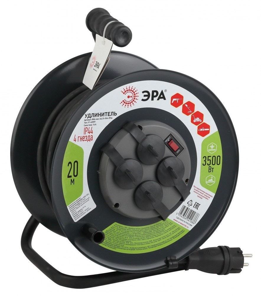 Удлинитель силовой ЭРА RMx-4es-3x2.5-20m-IP44(KG) на металлической катушке, с заземлением, с выключателем, КГ 3х2,5мм2, 4 гнезда, IP44, 16А / 3500Вт, провод 20м, оснащен несколькими розеточными гнездами для возможности подключения одновременно до 4 электроприборов на удаленном расстоянии от стационарной розетки. Данная модель удлинителя на катушке подойдет для использования на даче, на строительной площадке, в производственных цехах и пр. Характеристики провода КГ позволяют работать с удлинителем в широком диапазоне температур (от -40 градусов до +50 градусов по Цельсию), что подойдет для любого времени года.