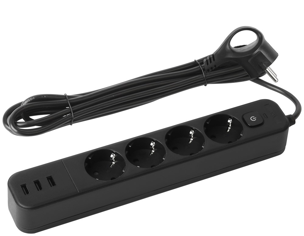 Сетевой фильтр ЭРА USF-4es-3m-3xUSBA-B с заземлением, с выключателем, 4 розетки, 3USB, провод 3м, ПВС 3x0,75мм2. Базовый уровень защиты техники: от импульсных помех, от перегрузки, от короткого замыкания. Максимальная мощность 10А/2200 Вт. Корпус из негорючего пластика (полипропилен). Вилка обеспечена кольцом для удобного извлечения ее из розетки. Выключатель со световой индикацией позволяет выключить все приборы, подключенные к сетевому фильтру, не вынимая вилки из розетки. Отлично подойдет для защиты бытовой и компьютерной техники. Сетевой фильтр оснащен 3USB для зарядки мобильных устройств.