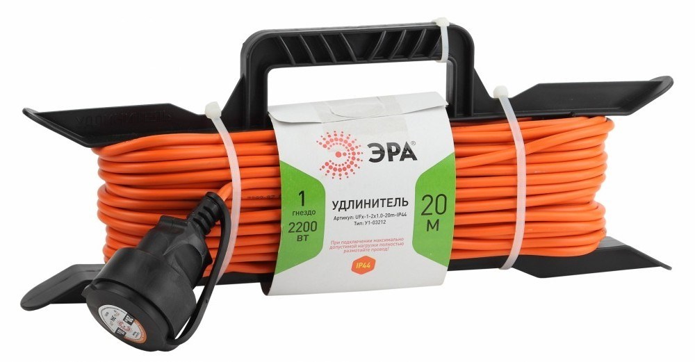 Удлинитель силовой на рамке UFx-1-2x1.0-20m без заземления, ПВС 2х1м2, 1 розетка, 20м, степень защиты IP20. Мощность 10А/2200Вт. Используется для работы на строительных площадках или дачных участках. Удобен при работе с приборами находящимися удаленно от стационарной розетки. Например, газонокосилки, электрические, пилы, триммеры или электродрели. Провод в удлинителях Эра сделан из 100% меди, что делает его абсолютно пожаробезопасным. Рама-полипропилен.