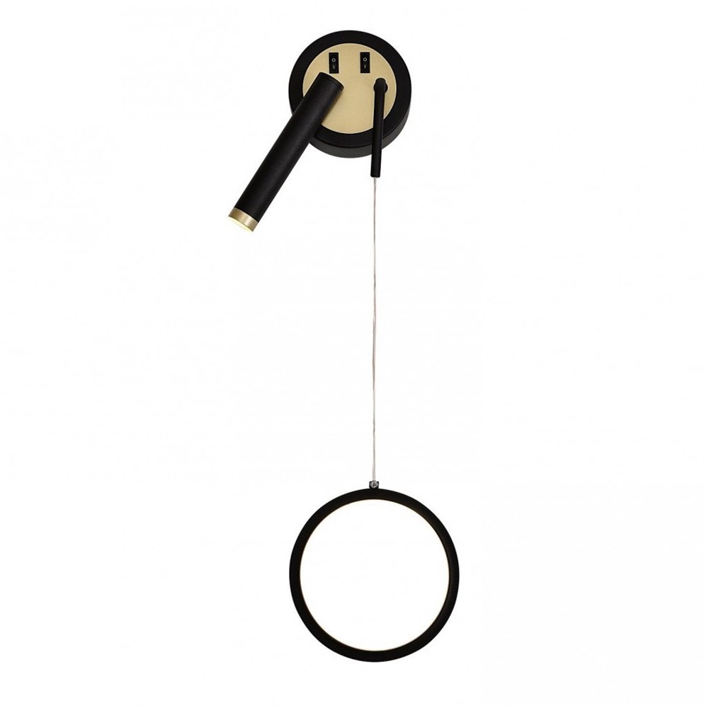 настенный светильник, металличексий каркас черного матового цвета с золотыми вставками, акрил, два источника света - светодиодная лента LED 3W и 10W. Поворотный спот на 360.