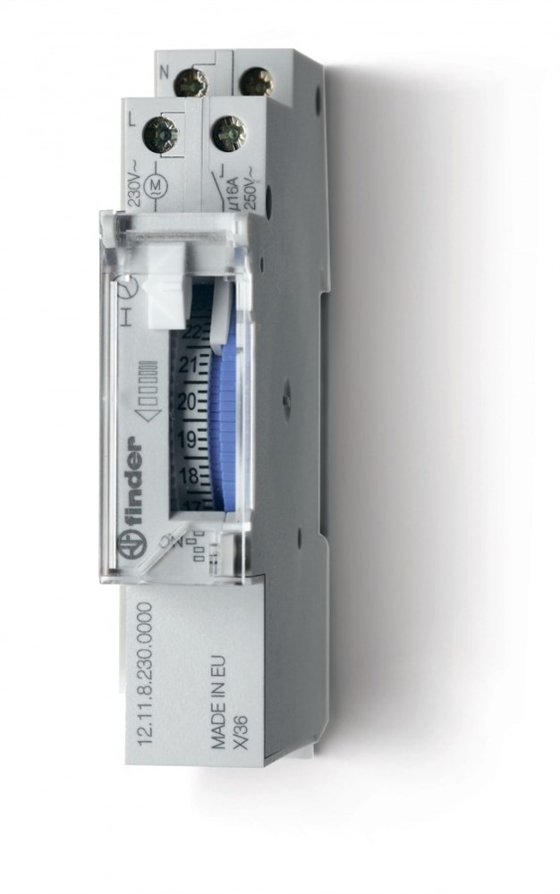 Finder Реле времени механическое суточное; монтаж на рейку 35мм; 1NO 16A; питание 230В АC; ширина 17.6мм; без резервн.источника питания; степень защит 121182301000