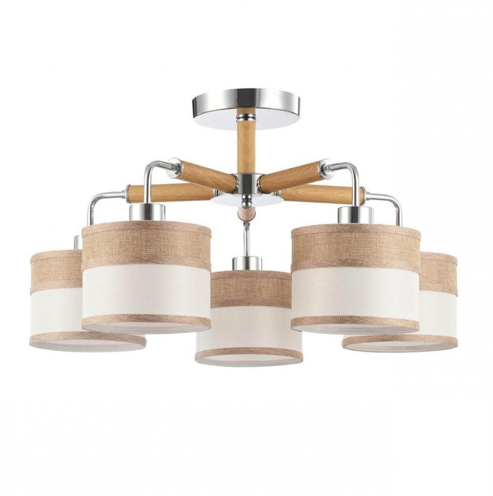Двухцветные абажуры, сделанные из мешковины, сочетаются с древесной арматурой. Благодаря большому ассортименту изделий серии Helen легко выбрать светильник как для просторных помещений, так и для небольших. Потолочный светильник FR5329-PL-05-CH; Высота-305; Высота при подвесном креплении--; Диаметр-600; Ширина--; Глубина--; Цоколь-E27; Мощность-40W