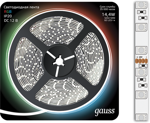 Gauss Лента LED 5050 -SMD 14.4W 12V DC RGB (блистер 5м) 312000414