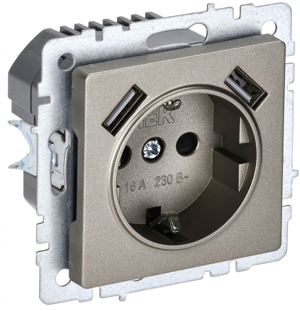 IEK Brite Base шампань розетка с заземлением и шторками, 16А с USB A+A 2,1А BR-R14-16-U21-D21-K37
