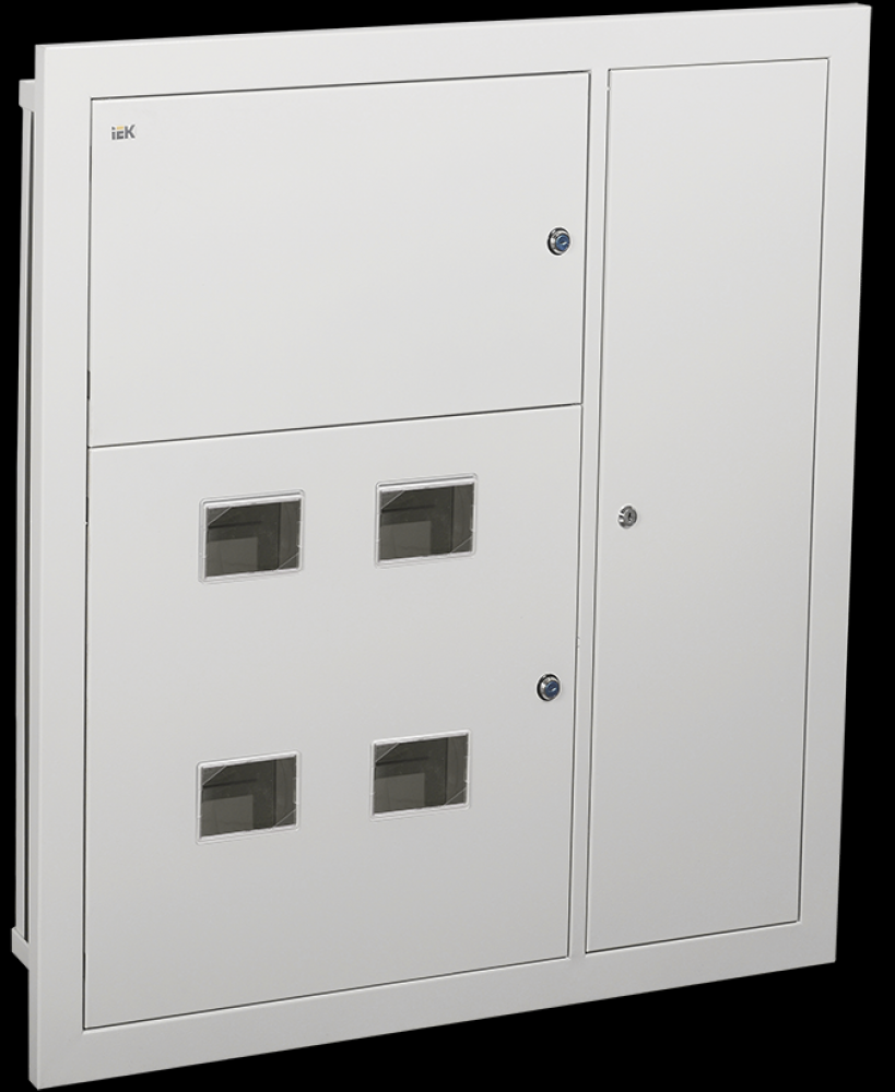 Используется для сборки этажного распределительного щита на 4 квартиры, предназначенного для приема и распределения электроэнергии в жилых и общественных зданиях, а также для защиты отходящих линий при перегрузках и коротких замыканиях. Сварной металлический корпус состоит из трех отсеков: вводно-учетного, распределительного, отсека слаботочного оборудования. В вводно-учетном и распределительном отсеках размещены DIN-рейки для крепления счетчиков (по количеству квартир). В распределительном отсеке установлены DIN-рейки для аппаратов групповых линий и рейка для установки шин N и РЕ. Отсек укомплектован оперативной панелью. Отсек слаботочного оборудования снабжен перфорированными профилями для прокладки теле- и радиосетей, телефонных линий, сетей охранной сигнализации, домофонов и т.п. Для обеспечения пожарной безопасности между слаботочным и силовым отсеками расположена разделительная перегородка.