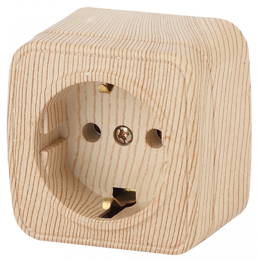 Розетка серии Intro Polo открытой установки цвет сосна 3-202-11. Номинальные характеристики 16А 250В. Розетка выполнена из термопласта, керамики, стали и латуни, оснащёна винтовыми зажимами.