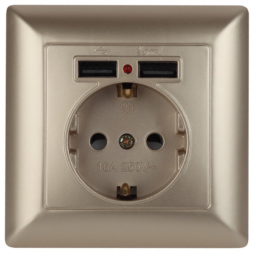 Intro 4-410-04 Розетка P+E Schuko со шторками, 16А-250В + 2хUSB, СУ, Solo, шампань (10/100/2500) Б0043406