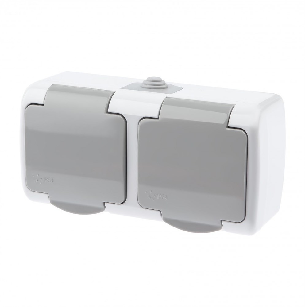 Intro Розетка Atlantic 5-204-03 двойная с заземлением 2х2P+E Schuko шторки, 16А-250В, IP54, открытой установки, серый Б0051061