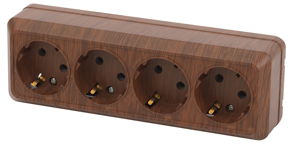 Розетка четырёхместная 4х2P+E Intro серии Quadro с заземлением 2-208-10 открытой установки, цвет венге, выполенена из негорючего термопласта; номинальные характеристики: 16А-250В, IP20.