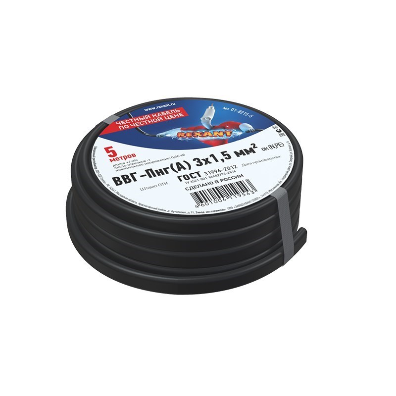 Кабель силовой медный ВВГ-Пнг(А) 3x1,5 мм², длина 5 метров, ГОСТ 31996-2012, ТУ 16-705.499-2010 Rexant 01-8215-5