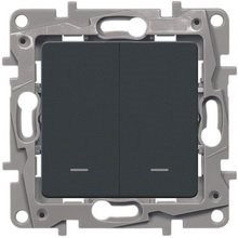 Переключатель с подсветкой двухклавишный Legrand Etika для скрытого монтажа, номинальный ток 10 А, цвет антрацит. Предназначен для управления двумя нагрузками с одного или с двух мест. Особенности:- Лампы подсветки светодиодные (2 шт.) заменяемые, цвет подсветки- белый. - Благодаря изменяемой схеме подключения, лампа подсветки либо облегчает ориентирование в темноте, либо информирует о включении нагрузки.- Матовый,материал клавиши AБС пластик- стоек к выгоранию и загрязнениям. Ход короткий, не громкий. - Все токоведущие части выключателя имеют защиту от случайного прикосновения- Безвинтовые зажимы для присоединения проводов не требуют обслуживания.Особенности серии Etika: - Корпус механизма- высококачественный поликарбонат, не проводит электрический ток, не поддерживает горение.- Специальный профиль внешнего контура механизма обеспечивает простоту и безошибочность многопостового монтажа. - Острые крепёжные лапки с широким углом раскрытия, обеспечивают надёжную фиксацию в монтажной коробке.