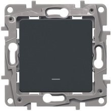 Переключатель с подсветкой одноклавишный Legrand Etika для скрытого монтажа, номинальный ток 10 А, цвет антрацит. Предназначен для управления нагрузкой с одного или с двух мест. Особенности:- Лампа подсветки светодиодная, заменяемая, цвет подсветки- белый. - Благодаря изменяемой схеме подключения, лампа подсветки либо облегчает ориентирование в темноте, либо информирует о включении нагрузки. - Матовый ,материал клавиши AБС пластик- стоек к выгоранию и загрязнениям.- Ход короткий, не громкий. - Все токоведущие части выключателя имеют защиту от случайного прикосновенияОсобенности серии Etika:- Корпус механизма- высококачественный поликарбонат, не проводит электрический ток, не поддерживает горение. - Специальный профиль внешнего контура механизма обеспечивает простоту и безошибочность многопостового монтажа. - Острые крепёжные лапки с широким углом раскрытия, обеспечивают надёжную фиксацию в монтажной коробке.