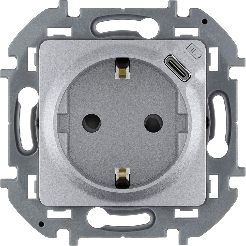 Комбинированная розетка 2К+З с зарядным устройством USB тип С Legrand Inspiria для скрытого монтажа, цвет Алюминий. Максимальный ток розетки 16АХ, напряжение розетки 250В, напряжение зарядного устройства =5В, максимальный зарядный ток 1500 мА. Применяется для одновременного электропитания бытовых потребителей и зарядки мобильного устройства. Оснащена интегрированными шторками, которые защищают детей и других пользователей от удара электрическим током. Особенности изделия: - Устройство размещается в 1 установочное место и подходит для многопостового монтажа без ограничений. - Возможно одновременное подключение двух устройств для элекропитания и зарядки. - Стандартный ток розетки 16 АХ позволяет осуществлять электропитание любых бытовых электроприборов без ограничений. - Защитные шторки интегрированы в механизм, обеспечивают высокий уровень электробезопасности и не затрудняют подключение и извлечение вилки. - Зарядный модуль интегрирован в схемотехнику, не требуя дополнительных подключений и соединений при установке. - Современный реверсивный разьем USB тип С очень удобен в использовании и актуален для будущих гаджетов. - Зарядный модуль оснащен встроенной защитой от перегрузки, что повышает безопасность его использования в быту. - Стандартное подключение к электросети двумя проводами (фаза и нейтраль) позволяет легко заменить стандартную электрическую розетку.