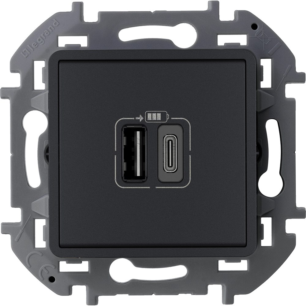 Зарядное устройство Legrand Inspiria для скрытого монтажа , тип А-тип С, цвет Антрацит. Напряжение 240В/=5В, максимальный зарядный ток 3000 мА. Применяется для непосредственной зарядки одного или двух мобильных устройств. Особенности изделия: - Увеличенный до 3000мА зарядный ток способствует сокращению времени заряда мобильных устройств. - Разьемы двух стандартов - классический тип А и современный реверсивный тип С для максимальной гибкости и совместимости с любыми гаджетами. - Возможна одновременная зарядка двух устройств - Стандартное подключение к электросети двумя проводами (фаза и нейтраль) позволяет легко заменить стандартную электрическую розетку - Подсоединение проводов электросети с помощью винтовых клемм.