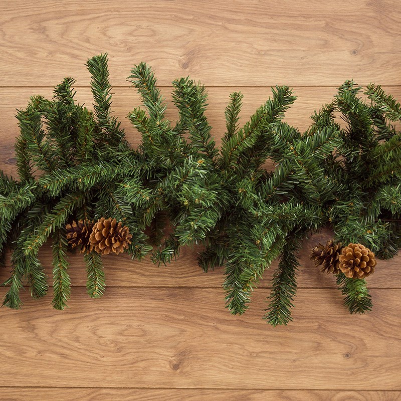 Гирлянда украшена натуральными шишками, что добавляет ей естественности.