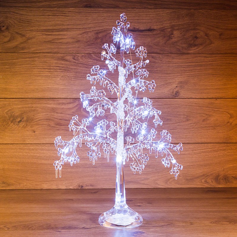 Фигура на подставке "Ель" высотой 51 см - интересный вариант для оформления интерьера, который поможет ощутить зимнюю сказку и приближение самого любимого праздника в году. Раскидистое новогоднее дерево выполнено из прозрачного пластика. Детализированные ветки эффектно подсвечиваются 15 диодами, излучающими белый свет нейтрального оттенка. Изделие работает от 3 батареек типа ААА. Независимость от электрической розетки открывает широкие возможности для создания оригинальныx декоративныx композиций.