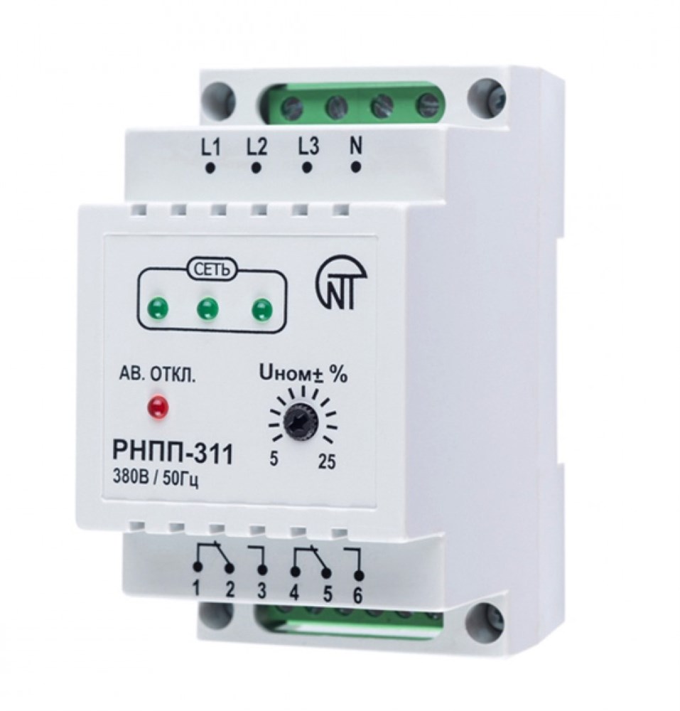 Реле напряжения для защиты 3-фазн. потребителей от осн.видов аварии в эл.сети; Uном/фаз=380В; f=45-55Гц; диап. регул. по Umin и Umax, 5-25% от ном; клим.исп. УХЛ4; монтаж на станд. DIN-рейку