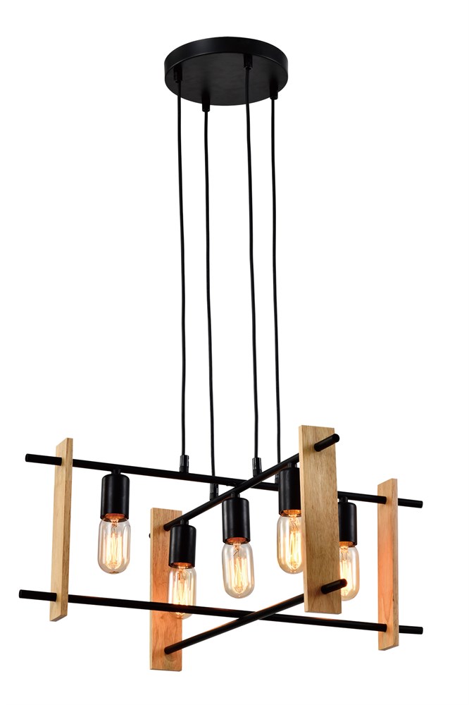 Подвесная каркасная люстра с открытыми источниками света - Rivoli Elizabeth (арт. 5107-305). Люстра на тросах под 5 ламп Е27 40 Вт. Высоту подвеса люстры можно отрегулировать при монтаже люстры на потолок, укоротив тросы. Основание люстры круглое, металлическое, чёрного цвета. Накладной способ установки позволяет быстро разместить данную дизайнерскую люстру на любом потолке. Реечный каркасный корпус подвесной дизайнерской люстры окрашен гальваническим способом в два цвета – чёрный и светлое дерево. Коллекцию Rivoli Elizabeth в стиле лофт-кантри дополняют подвесные светильники под 1 лампу (арт. 5107-201) и под 3 лампы (арт. 5107-203).