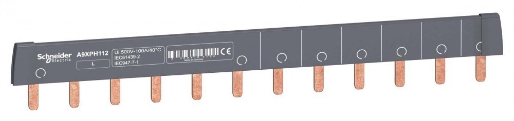 ШИНКА ГРЕБЕНЧАТАЯ 1П (L1...) 12 МОД.18ММ 100А РАЗРЕЗАЕМАЯ. Использование гребенчатых шинок упрощает установку оборудования. Они могут быть разрезаны за один заход. В комплект входят 2 боковые заглушки IP20. После разрезания шинки установка заглушек обязательна. На каждую сторону шинки нанесена маркировка для идентификации фаз при установке во всех позициях. Места разрезов помечены на изоляции.