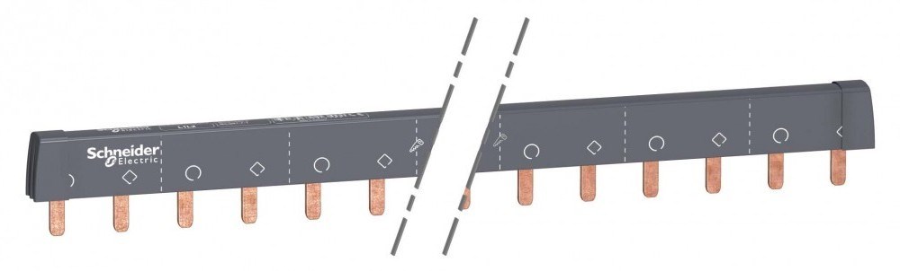 2 ГРЕБЕНЧАТЫЕ ШИНКИ 2П. 48 МОД. 9ММ. Использование гребенчатых шинок упрощает установку оборудования. Они могут быть разрезаны за один заход. В комплект входят 2 боковые заглушки IP20. После разрезания шинки установка заглушек обязательна. На каждую сторону шинки нанесена маркировка для идентификации фаз при установке во всех позициях. Места разрезов помечены на изоляции.