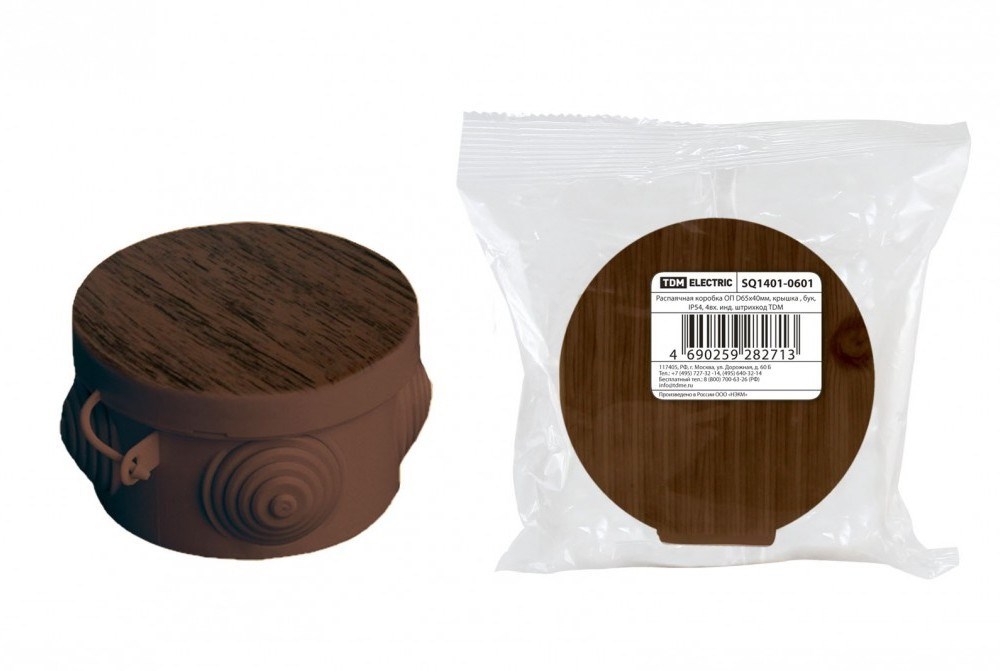 TDM Распаячная коробка ОП D65х40мм, крышка , "ЭКО" (венге), IP54, 4вх. инд. штрихкод SQ1401-0601