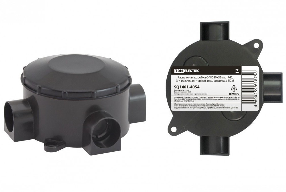 TDM Распаячная коробка ОП D80х35мм, IP42, 3-х рожковая, черная, инд. штрихкод SQ1401-4054