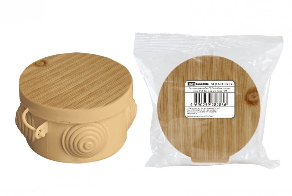 TDM Распаячная коробка ОП D85х40мм, крышка, "ЭКО" (сосна), IP54, 4вх. инд. штрихкод SQ1401-0702