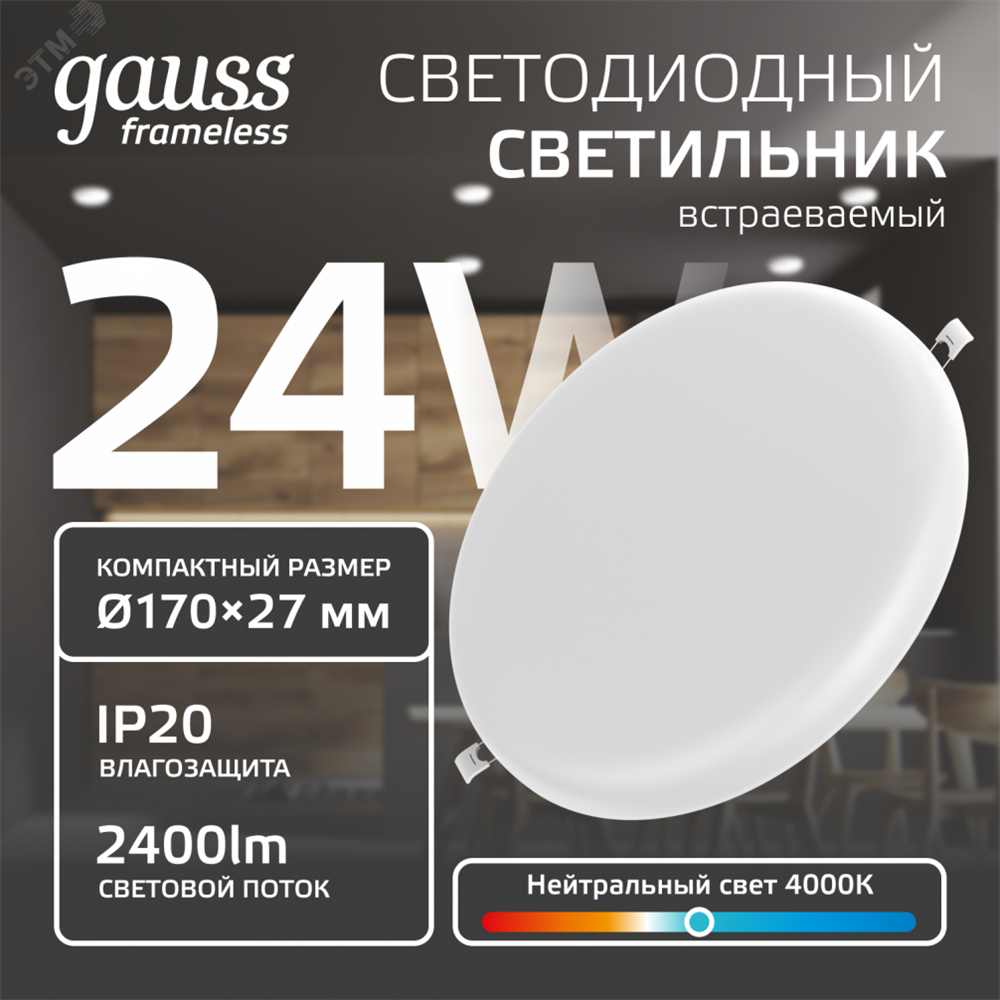 Встраиваемый светильник Frameless круг 24W, 4000K, 1/30 967511224 pe737253