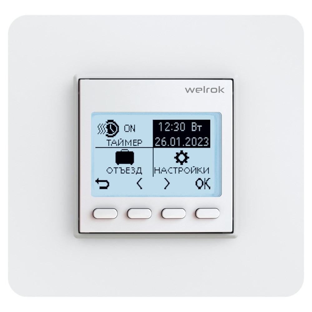 Широкое применение Welrok pro - терморегулятор с возможностью программирования недельного графика обогрева. Вы можете установить до 16 интервалов для каждого дня недели. В праздничные дни при желании можно установить индивидуальное расписание. Список праздничных дней можно выбрать из готового шаблона или создать индивидуальный. Максимальная экономия за счет: — гибкой настройки графика нагрева с использованием до 16 температурных периодов каждый день; — временного отключения нагрева при резком падении температуры в помещении, например, при проветривании; — поддержания экономной температуры во время отъезда; — возможности скорректировать расписание на основании данных статистики энергопотребления в регуляторе. Достижение максимального комфорта благодаря включению нагрева заранее в зависимости от особенностей помещения. Простая настройка работы терморегулятора благодаря мастеру настройки. Комплект 1. терморегулятор Welrok pro 2. декоративная рамка 3. технический паспорт, инструкция по установке и эксплуатации, гарантийный талон 4. упаковочная коробка