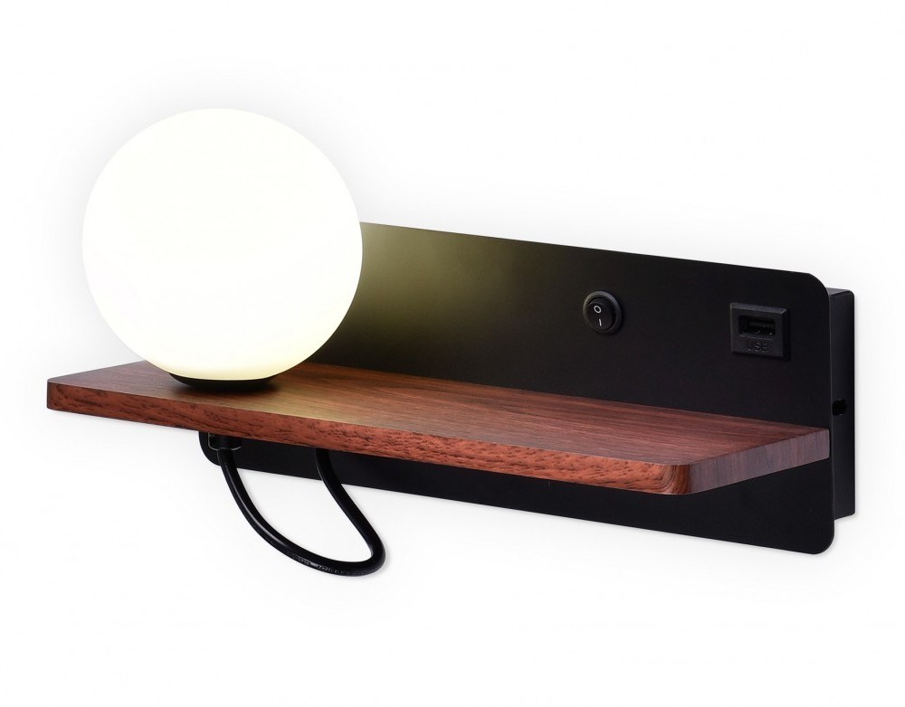 Ambrella Настенный светильник с выключателем, USB портом и полкой FW521 BK/DW черный/темное дерево G9 max 40W 280*100*125 (лампа LED G9 5W 4200K в ком FW521