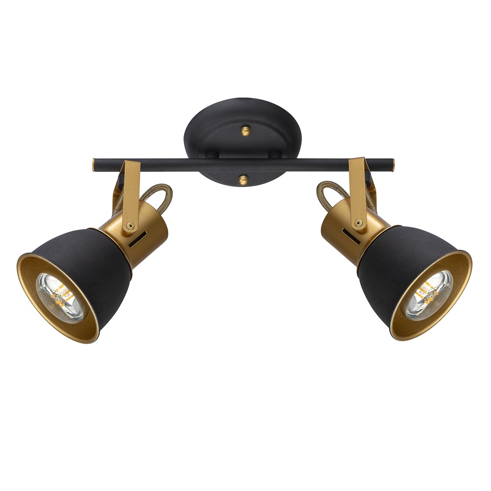 Спот с двумя плафонами A1677PL-2GO серии JOVI. Подчеркнет стиль помещения. Размеры 28x9x22 cm. Параметры пылевлагозащиты IP — 20. Форма декоративная. Плафон металлический чёрный, а материал/цвет арматуры металл/золотистый. Использует лампу с цоколем E14. Площадь освещения охватывает 2,5 m². ² Идеально подходит для кухни, для прихожей, для офиса. Страна происхождения бренда — ИТАЛИЯ.