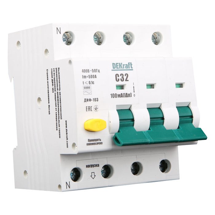 Автоматический выключатель дифференциального тока серии ДИФ-103 DEKraft; 3P+N; ном.ток 10 А; характеристика C; откл.способность Icn = 6 kA; ток утечки 30 мА; тип - АС; блок дифф.защиты and ndash; электронный; ширина and ndash; 2 мод. х 18 мм; монтаж and ndash; на DIN-рейку. АВДТ применяются в сетях напряжением до 220 В пер.тока для защиты человека от поражения электрическим током и электроустановок от сверхтоков и токов утечки. Аппараты ДИФ-103 являются более компактным вариантом АВДТ по сравнению с серией ДИФ-101.