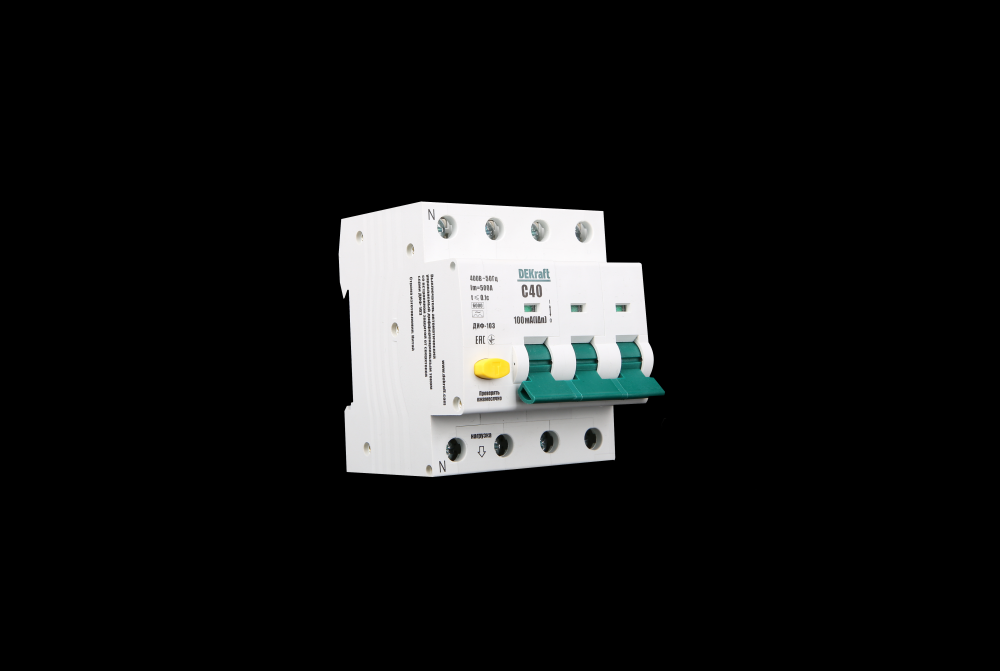 Автоматический выключатель дифференциального тока серии ДИФ-103 DEKraft; 3P+N; ном.ток 25 А; характеристика C; откл.способность Icn = 6 kA; ток утечки 100 мА; тип - АС; блок дифф.защиты and ndash; электронный; ширина and ndash; 2 мод. х 18 мм; монтаж and ndash; на DIN-рейку. АВДТ применяются в сетях напряжением до 220 В пер.тока для защиты человека от поражения электрическим током и электроустановок от сверхтоков и токов утечки. Аппараты ДИФ-103 являются более компактным вариантом АВДТ по сравнению с серией ДИФ-101.
