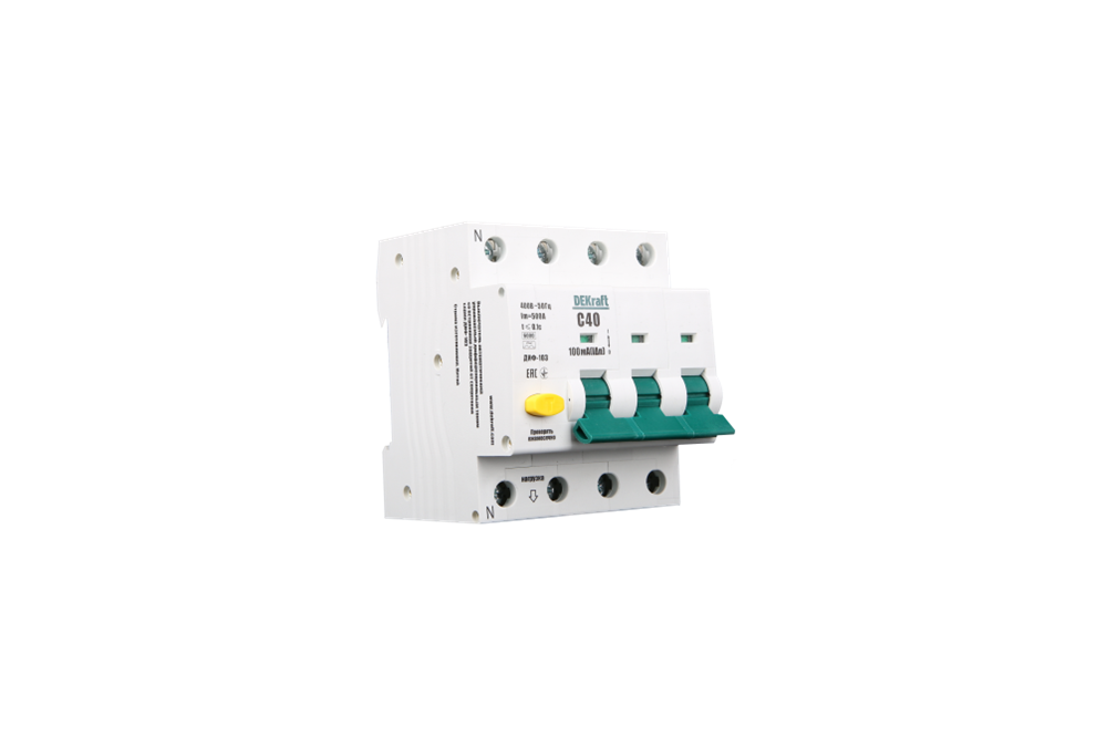 Автоматический выключатель дифференциального тока серии ДИФ-103 DEKraft; 3P+N; ном.ток 32 А; характеристика C; откл.способность Icn = 6 kA; ток утечки 100 мА; тип - АС; блок дифф.защиты and ndash; электронный; ширина and ndash; 2 мод. х 18 мм; монтаж and ndash; на DIN-рейку. АВДТ применяются в сетях напряжением до 220 В пер.тока для защиты человека от поражения электрическим током и электроустановок от сверхтоков и токов утечки. Аппараты ДИФ-103 являются более компактным вариантом АВДТ по сравнению с серией ДИФ-101.