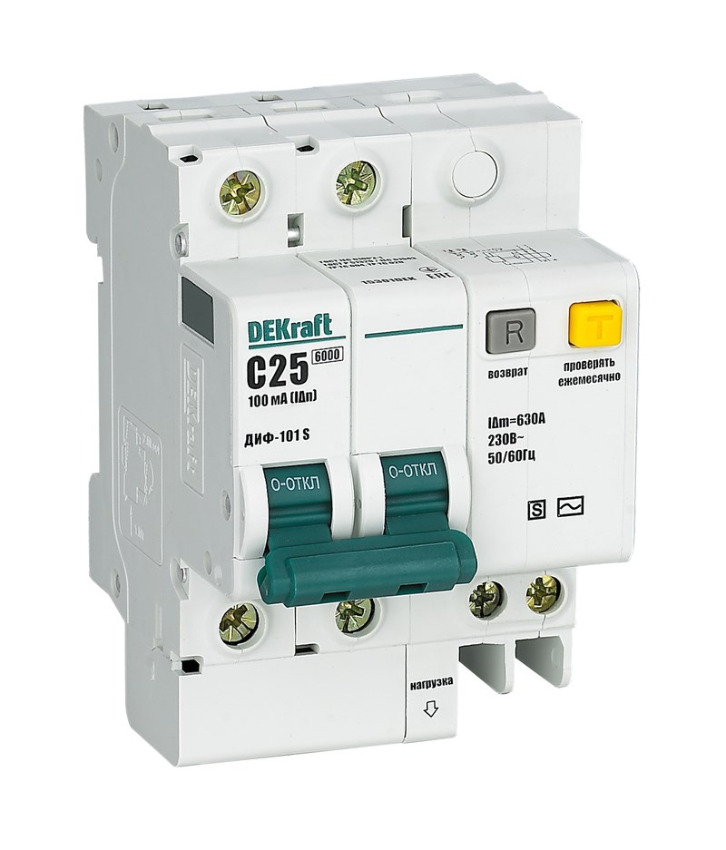 Автоматический выключатель дифференциального тока серии ДИФ-101 S DEKraft; селективный; 2P; ном.ток 32 А; характеристика C; откл.способность Icn = 6 кА; ток утечки 100 мА; блок дифф.защиты and ndash; электронный; ширина and ndash; 3,5 мод. х 18 мм; монтаж and ndash; на DIN-рейку. АВДТ применяются в сетях напряжением до 400 В пер.тока для защиты электроустановок от сверхтоков и токов утечки; в щитах, где требуется ступенчатая дифференциальная защита (задержка по срабатыванию).