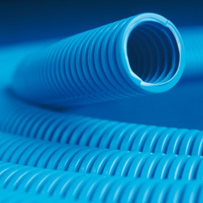 Гофрированные трубы из самозатухающего полипропилена не распространяют горение. Материал устойчив к экстремальным температурным воздействиям, а высокая ударная прочность и эластичность позволяют применять трубы в монолитном бетоностроении. В серии выпускаются легкие, тяжелые и сверхтяжелые трубы, отличающиеся по весу, уровню ударопрочности и устойчивости к нагрузкам. Трубы применяются для прокладки электрических, телефонных, компьютерных кабелей. Диаметр трубы - 40 мм. Цвет - синий.
