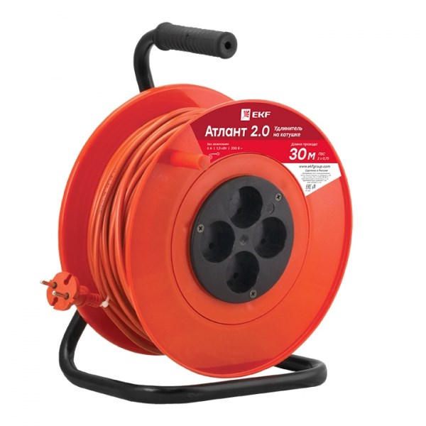 EKF PROxima Удлинитель на катушке "Атлант 2.0" 4 гнезда 30м без заземления ПВС 2*0,75 6А/1,3кВт UKA02-06-275-4-30