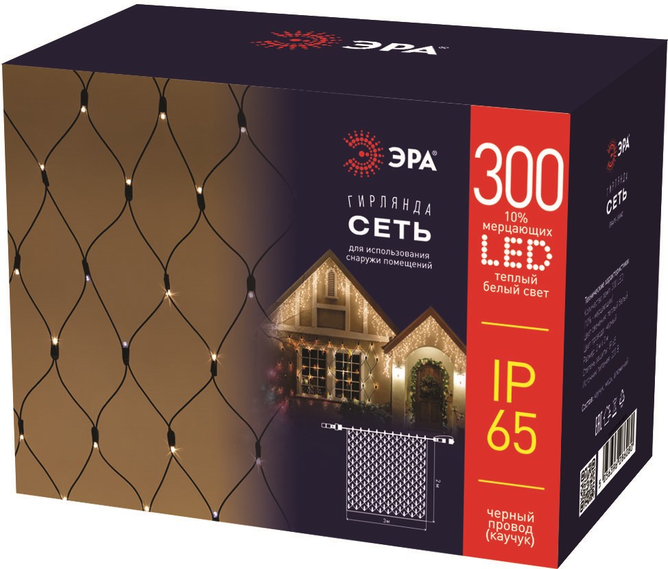 ЭРА ERAPS-SKW2 Гирлянда 300LED Сеть 2м*3м, теплый белый свет, бел. мерц, черный каучук, 220В, IP65 Б0051898