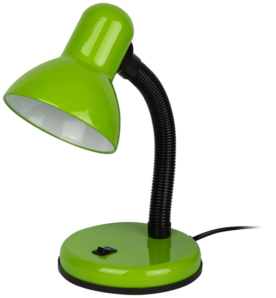 Настольный светильник с металлическим плафоном. Направление света регулируется гибкой стойкой, которая обеспечивает наклон и поворот плафона в любом направлении. Выключатель на основании. Классический дизайн. Предназначен для использования с лампой накаливания или компактной люминесцентной лампой (КЛЛ).